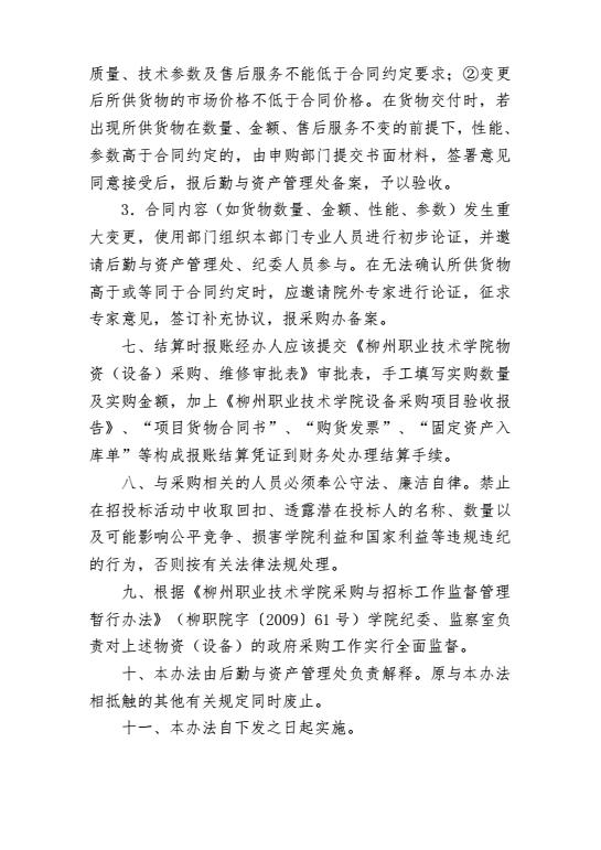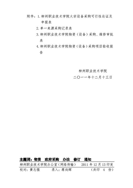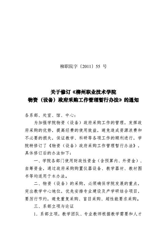 关于修订《柳州职业技术学院物资(设备)政府采购工作管理暂行办法》的通知 柳职院字【2011】55号