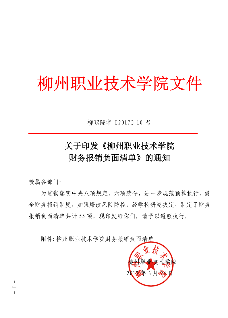 柳职院字〔2017〕10 号关于印发《柳州职业技术学院财务报销负面清单》的通知 来源: 发布时间:2021-02-26 12:12:58 浏览次数: 次 【字体:小 大】 终审:财务处 分享到: 【打印正文】