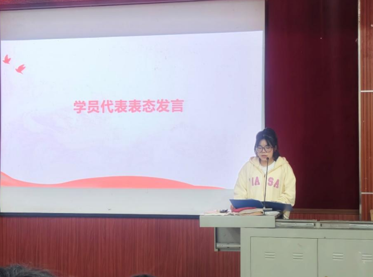 其次,学院代表劳丹萍同学作表态发言。她表示:“从递交入党申请书的那一刻起,我便以党员标准严格要求自己。本次培训是思想的‘加油站’、行动的‘指南针’,我们定会严守纪律、潜心学习,在实践中践行‘请党放心,强国有我’的青春誓言!”