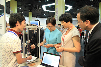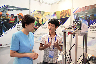 来到我院展位前,作品主创张晋华同学主动将事前用“激光雕刻与快速成型机”雕刻打印好的竹木名片递给了鲁昕副部长,精致、新奇的竹木名片,立刻引起了她的兴趣,在操作台前向张晋华同学详细了解此展品的功能、特点、作用。面对信息化时代,面对机器换人社会发展趋势,鲁副部长说:“希望你们继续搞这些创新发明,采用先进技术服务社会发展。”鞠红霞副院长说:“学校成立有创新工作室,学生创新技能作品屡获国家级嘉奖,搞创新技能作品在学校学生中形成了一种氛围、一种习惯,学校将继续大力支持学生搞创新发明,服务产业转型升级。”鞠副院长随即简单介绍了bb贝博开展国际化办学服务地方产业升级的情况。