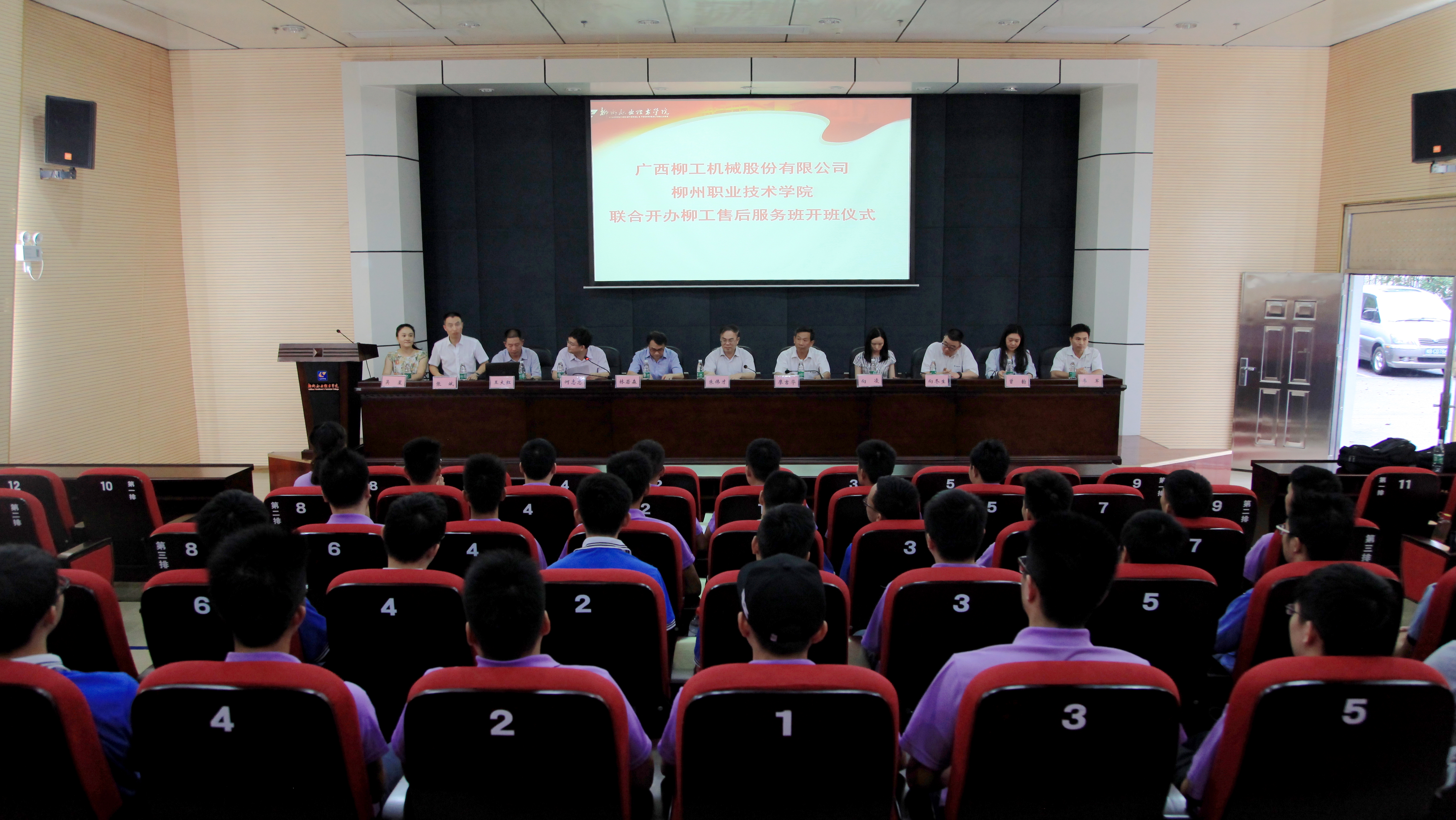 新闻网消息(科技开发处、校企合作处与就业处/韦丽娜 图/朱敬民 陈明鑫)2016年7月11日上午9时,广西柳工机械股份有限公司—柳州职业技术学院联合开办“柳工售后服务班” 开班仪式在行政楼100报告厅举行。柳工机械股份有限公司总裁助理廖吉华先生、国际营销事业部相关领导,校党委书记朱伟才、副校长林若森,校企合作处、机电工程学院、汽车工程学院等部门领导和各二级学院老师代表、“柳工售后服务班”校企双方班主任、培训班全体学员出席开班仪式,开班仪式由校企合作处处长何志忠主持。