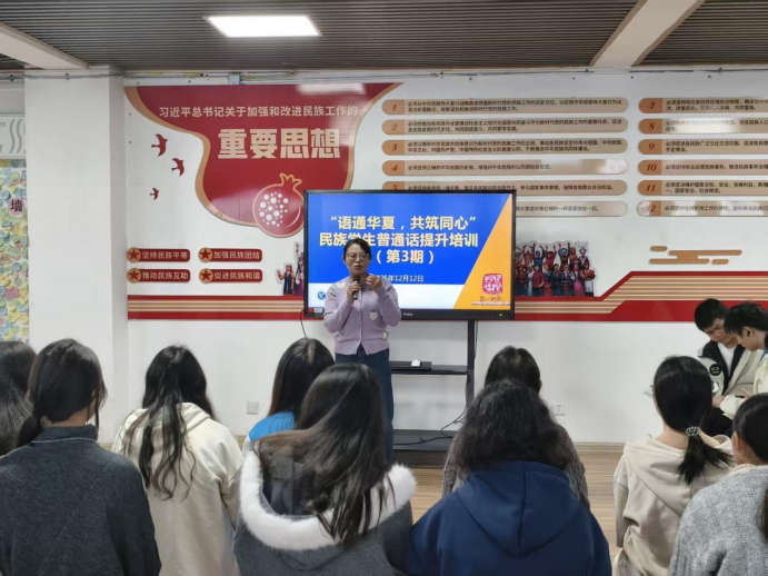 新闻网消息(文/图党委学生工作部(处)程志媛)为持续推动民族学生普通话水平提升,深化各民族学生之间的语言互通与文化共融,党委学生工作部(学生工作处)于2025年12月20日下午在官塘校区尔园“石榴籽”民族团结工作站(“石榴籽”辅导员工作室)举办2025年民族学生普通话水平提升培训班第3期。此次培训班邀请到国家级普通话测试员韦蝶青老师担任主讲,她围绕普通话发音、朗读技巧等内容授课,通过互动练习帮助民族学生夯实语言基础。