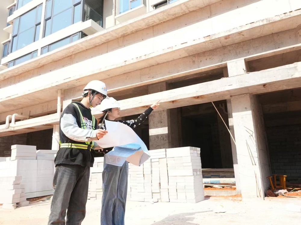 黄小铁(右)带领学生走进在建楼盘进行实训